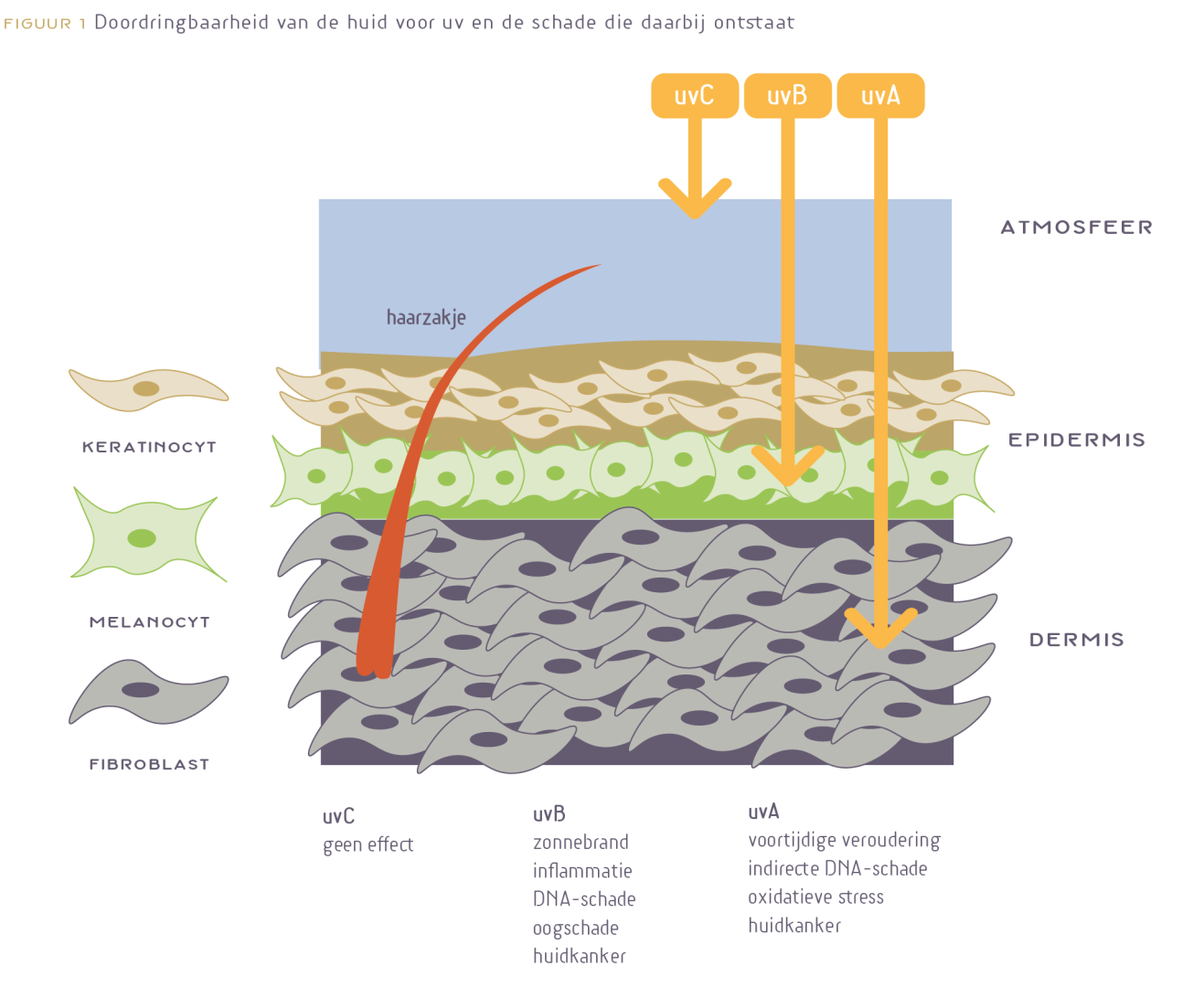 Figuur 1 Doordringbaarheid van de huid voor uv en de schade die daarbij ontstaat