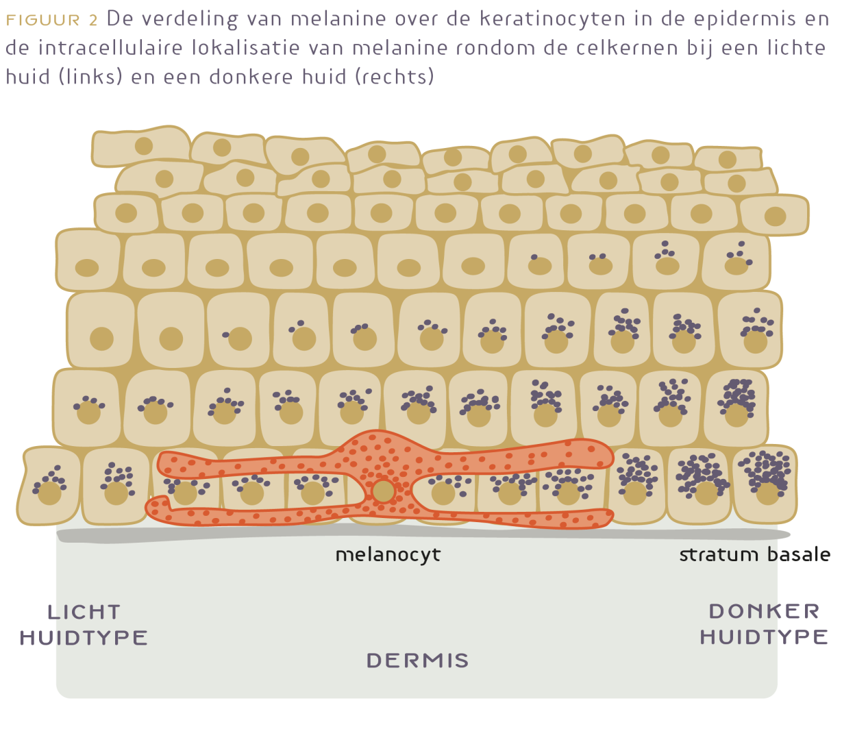 figuur 2 De verdeling van melanine over de keratinocyten in de epidermis en de intracellulaire lokalisatie van melanine rondom de celkernen bij een lichte huid (links) en een donkere huid (rechts)